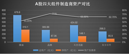 從組件制造商的資產(chǎn)體量上看,隆基資產(chǎn)規(guī)模最大,同時資產(chǎn)負(fù)債率最低。