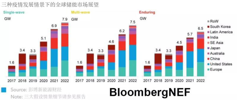 如果所有國家都僅經(jīng)歷單波沖擊,則2019年至2022年,儲(chǔ)能市場預(yù)計(jì)每年增長25%。多數(shù)國家的儲(chǔ)能市場規(guī)模增速已經(jīng)超過25%。在多波反彈和持久反復(fù)情景下,市場規(guī)模增速分別降至23%和19%。