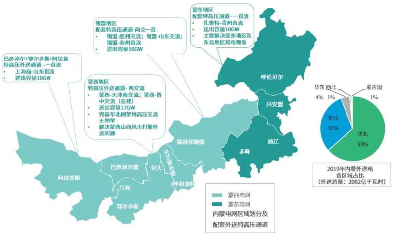 內(nèi)蒙古2019年跨省跨境外送電量達(dá)到2082億千瓦時,其中送華北電量最高(1322億千瓦時,占比63%),其次是東北(637億千瓦時,占比31%),另還有少量電量送華東、西北及跨境送出至蒙古國。