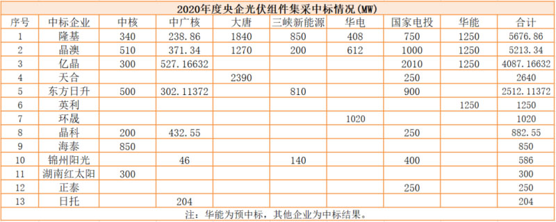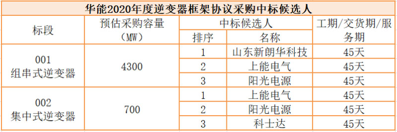 8月31日,華能集團(tuán)2020年度5GW光伏組件和逆變器框架協(xié)議采購(gòu)中標(biāo)候選人公示。組件標(biāo)段,晶澳、正泰、英利、隆基、億晶、晶科入選中標(biāo)候選人;逆變器標(biāo)段,山東新朗華科技有限公司(華為),上能電氣、陽(yáng)光電源、科士達(dá)入選中標(biāo)候選人。詳情如下: