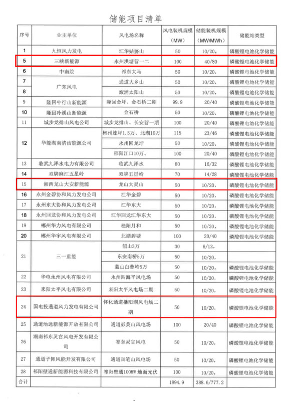 今年3月,國(guó)網(wǎng)湖南省電力有限公司發(fā)展部曾下發(fā)《關(guān)于做好儲(chǔ)能項(xiàng)目站址初選工作的通知》,文件顯示湖南28家企業(yè)承諾新能源發(fā)電項(xiàng)目配套儲(chǔ)能,總規(guī)模達(dá)388.6MW/777.2MWh。此次啟動(dòng)招標(biāo)的三個(gè)項(xiàng)目均位列其中。