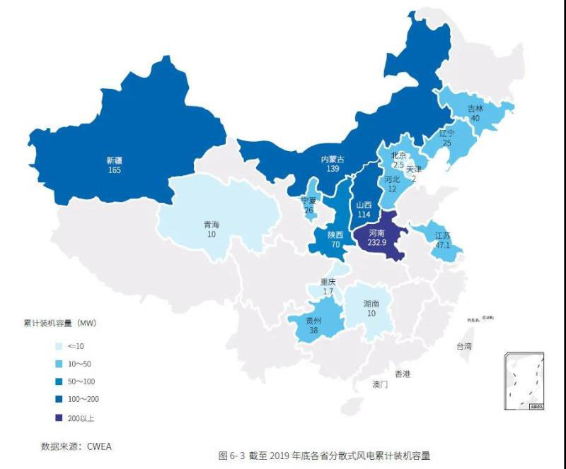 2019年,中國分散式風電(分散式、分布式、智能微網)新增裝機容量為300MW,同比增長114.8%;累計裝機容量達到935MW,同比增長47.8%。截止2019年底,共有9 家制造企業(yè)和36 家開發(fā)商有分散式風電裝機。其中主要分布的省區(qū)為河南、新疆、內蒙古、山西、陜西等。