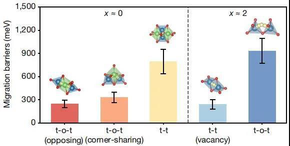 圖4. 在Li3V2O5放電開始時(shí)的Li遷移勢(shì)壘(x≈0)和放電結(jié)束時(shí)的空位遷移勢(shì)壘(x≈2)。