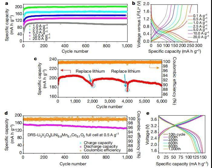 圖3. DRS-Li3V2O5的電化學(xué)性能。(a)電壓窗口為0.01-2.0 V的各種充放電電流密度下的循環(huán)穩(wěn)定性;(b)不同電流密度下的電壓曲線;(c)DRS-Li3V2O5在電流密度為1 A g-1下的長(zhǎng)循環(huán)穩(wěn)定性;(d)DRS-Li3V2O5 || LiNi0.8Mn0.1Co0.1O2全電池在0.5 A g-1下的循環(huán)穩(wěn)定性;(e)在1.5-3.9 V的電壓窗口時(shí)的電壓曲線。從0.1 A g-1到20 A g-1的電流密度下,測(cè)試了活性物質(zhì)載量為2-3 mg cm2的DRS-Li3V2O5 電極,其充電放電時(shí)間為2.66h至20s。