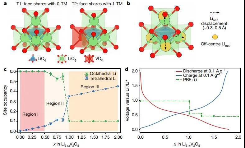 圖2. 由DFT計(jì)算得出DRS-Li3+xV2O5的 Li位置占有率和電壓曲線。(a)0-TM(T1)和1-TM(T2)四面體Li插入位點(diǎn);(b)當(dāng)Li插入0-TM(T1)位點(diǎn)時(shí),四個(gè)相鄰的LiO 6八面體的偏心位移;(c)根據(jù)DFT計(jì)算,在插入Li后,四面體和八面體中Li位置占有率的演變;(d)根據(jù)PBE+U函數(shù)計(jì)算得出的實(shí)驗(yàn)和計(jì)算電壓曲線。