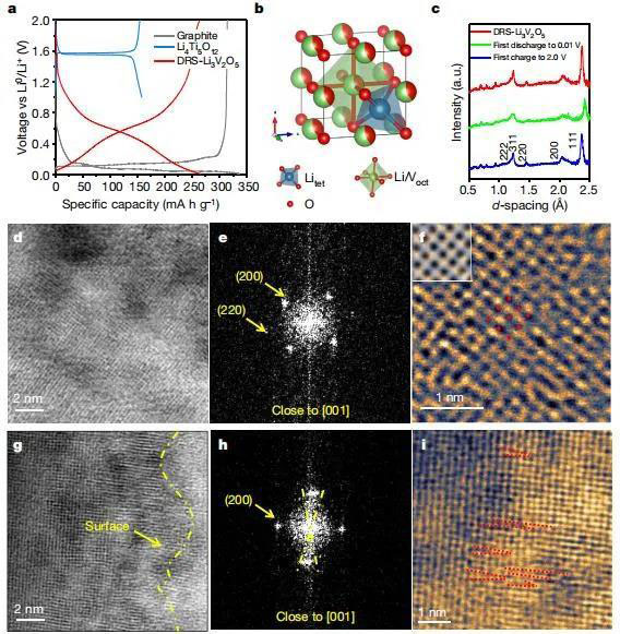 圖1. 原始和鋰化DRS-Li3+xV2O5的電壓曲線和結(jié)構(gòu)表征。(a)在電流密度為0.1 A g-1的情況下,石墨、Li4Ti5O12和DRS-Li3+xV2O5的實(shí)驗(yàn)電壓曲線;(b)DRS-Li3+xV2O5的晶體結(jié)構(gòu);(c)DRS-Li3+xV2O5和鋰化DRS-Li3+xV2O5的中子衍射;(d-i)DRS-Li3+xV2O5的ABF-STEM圖像和快速傅里葉變換。
