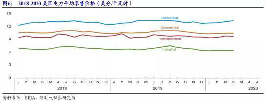 美國民用電價高昂,為當?shù)貞粲霉夥焖侔l(fā)展提供天然土壤。工業(yè)用電具備規(guī)模化效應,價格僅為民用電價的一半。根據(jù)美國能源信息署的數(shù)據(jù),2020年4月 份美國平均居民電價為13.28美分/千瓦時,由于工業(yè)用電具備規(guī)模效應,成本更低, 美國工業(yè)用電價格大約為民用電價的一半,僅為6.41美分/千瓦時。因此,從成本端考慮能源替代的角度,民用電價高昂為美國戶用光伏快速發(fā)展提供天然土壤。