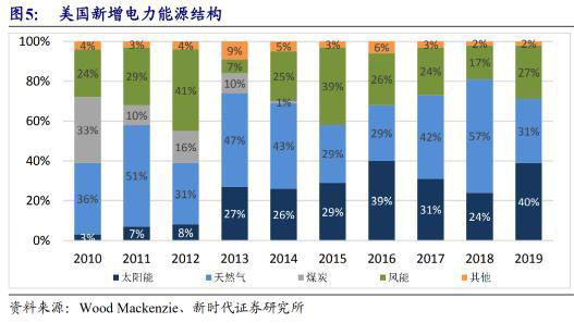 美國清潔能源意識增強,光伏度電成本低于天然氣、火電。根據(jù)BNEF數(shù)據(jù),美國帶追蹤系統(tǒng)的光伏電站,度電成本已經(jīng)低于天然氣發(fā)電,與陸上風電一起成為市場上最廉價能源。據(jù)美國能源信息署發(fā)布數(shù)據(jù)顯示,2019年美國發(fā)電裝機市場 中,光伏裝機比例高達40%,其次是天然氣裝機比例為31%。預計到2050年,隨著人們環(huán)保意識不斷增強和光伏度電成本的優(yōu)勢擴大,光伏的裝機比例將穩(wěn)步上升。