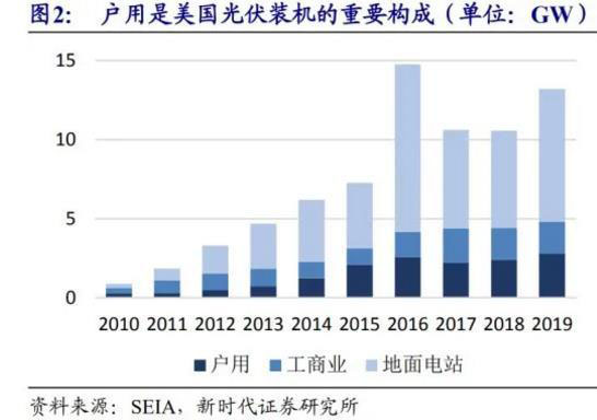 美國光伏穩(wěn)定增長,戶用光伏成長趨勢明顯。根據(jù)SEIA數(shù)據(jù),2019年美國光 伏新增裝機13.3GW,同+25.5%,其中戶用光伏新增裝機2.8GW,同比+16.7%, 戶用是美國光伏裝機的重要構成,占全年新增裝機21.05%。光伏系統(tǒng)成本下降帶來的經(jīng)濟性及支持政策,是美國戶用光伏發(fā)展的重要因素。