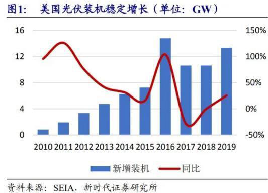 政策扶持是美國光伏產(chǎn)業(yè)發(fā)展的重大推動因素。(1)ITC 是美國太陽能產(chǎn)業(yè)發(fā) 展的重大推動因素。光伏ITC是指美國聯(lián)邦政府對美國住宅和商業(yè)太陽能項目的投 資稅收抵免。2006年到2016年ITC政策存續(xù)的10年間,美國太陽能光伏裝機量從15MW增長到16.5GW,實現(xiàn)了千倍的指數(shù)級增長。自2020年1月1日起,美 國太陽能稅收減免將從當前的30%下降至26%,到2021年將進一步降至22%。到2022年大型公共事業(yè)項目和商業(yè)項目抵免額將10%,住宅項目將不會獲得稅收抵免。(2)地方政府光伏政策的落地。根據(jù)美國加州2019建筑能效標準規(guī)定,2020年1月1日起加州所有三層及以下新建住宅都必須強制安裝戶用光伏系統(tǒng),為美國戶用光伏市場帶來增量。
