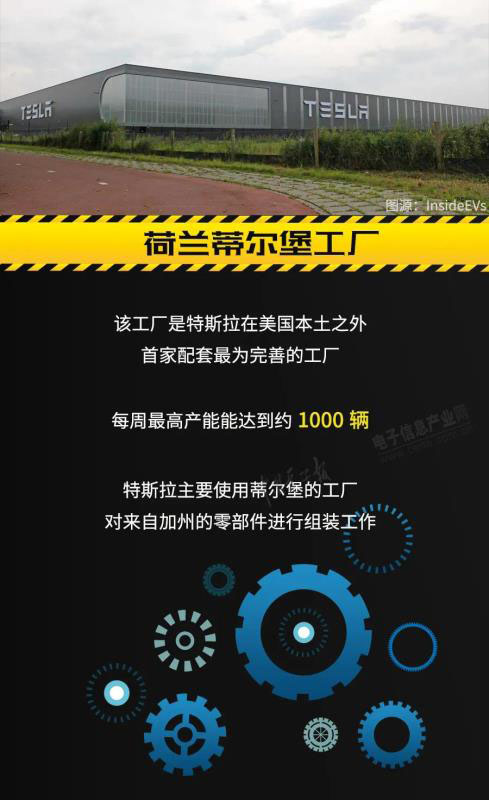 該工廠是特斯拉在美國本土之外首家配套最為完善的工廠,其所使用的設(shè)備來自特斯拉在加州費利蒙市的主要生產(chǎn)基地。這家在荷蘭的工廠每周最高產(chǎn)能能達到約1000輛。特斯拉主要使用蒂爾堡的工廠對來自加州的零部件進行組裝工作。