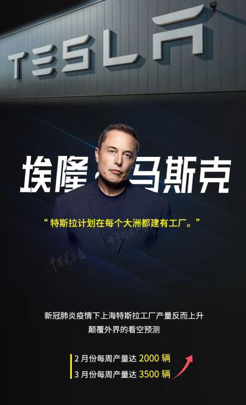 特斯拉有一位堪稱狂人的老板——埃隆·馬斯克,新冠肺炎疫情下,上海特斯拉工廠產(chǎn)量不降反升,顛覆了外界的看空預(yù)測。2月份每周產(chǎn)量達2000輛,3月份每周產(chǎn)量達到3500輛。
