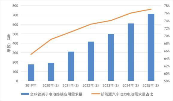 圖1 2020-2025年全球鋰離子電池需求量預(yù)測(cè)