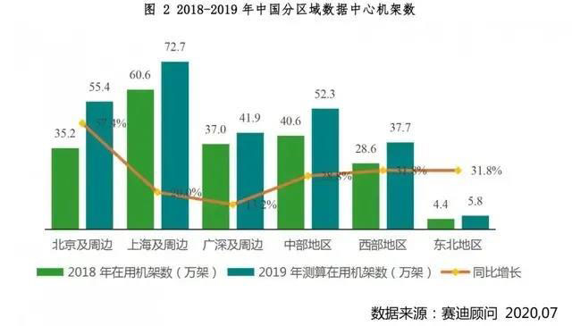 圖2 2018-2019年中國(guó)分區(qū)域數(shù)據(jù)中心機(jī)架數(shù)
