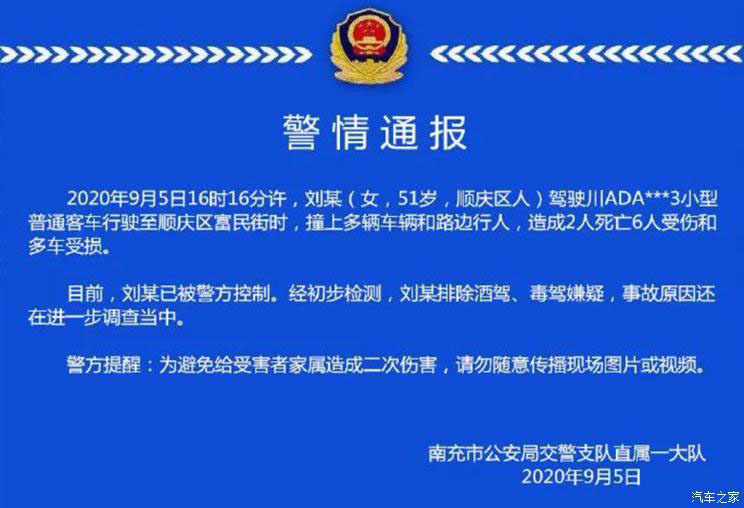 警情通報顯示,劉某(女,51歲,順慶區(qū)人)駕駛川ADA***3小型普通客車(特斯拉Model X)行駛至順慶區(qū)富民街時發(fā)生事故,目前劉某已被警方控制,且經(jīng)過初步檢測,已排除劉某酒駕、毒駕嫌疑,但事故原因還在進(jìn)一步調(diào)查中。
