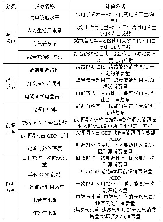根據(jù)城市群綜合能源供應(yīng)系統(tǒng)對(duì)能源系統(tǒng)的影響機(jī)理分析,依據(jù)層次性、科學(xué)性、可度量的原則,分別從基礎(chǔ)功能、清潔發(fā)展、能源安全、能源效率四個(gè)方面構(gòu)建評(píng)價(jià)指標(biāo),如表所示。同時(shí),考慮到不同維度指標(biāo)特性,提供了每個(gè)指標(biāo)的具體計(jì)算方法和變量說明。