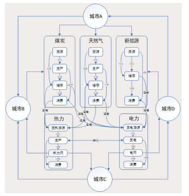 立足生態(tài)文明建設(shè),能源系統(tǒng)正逐步向綠色發(fā)展轉(zhuǎn)變,就是要發(fā)揮電力能源樞紐的作用,推動(dòng)能源的綠色轉(zhuǎn)型和清潔生產(chǎn),提供優(yōu)質(zhì)、多樣化的能源服務(wù),從而促進(jìn)社會(huì)的綠色轉(zhuǎn)型和可持續(xù)發(fā)展,最終實(shí)現(xiàn)生態(tài)文明社會(huì)。綜合能源系統(tǒng)是指在規(guī)劃、建設(shè)、運(yùn)營過程中,對(duì)能源的生產(chǎn)、輸配、轉(zhuǎn)換、儲(chǔ)存等環(huán)節(jié)進(jìn)行有機(jī)協(xié)調(diào)和優(yōu)化,形成的多能源、全鏈條的一體化系統(tǒng),城市群綜合能源系統(tǒng)是基于城市資源和負(fù)荷特性的差異,適應(yīng)不同城市發(fā)展趨勢(shì)的能源系統(tǒng)。整合區(qū)域內(nèi)煤炭、石油、天然氣、電力、熱能等多種能源,實(shí)現(xiàn)不同能源子系統(tǒng)協(xié)調(diào)規(guī)劃、優(yōu)化運(yùn)行、協(xié)同管理、互補(bǔ)的綜合能源體系的地理和功能表現(xiàn),如圖所示。