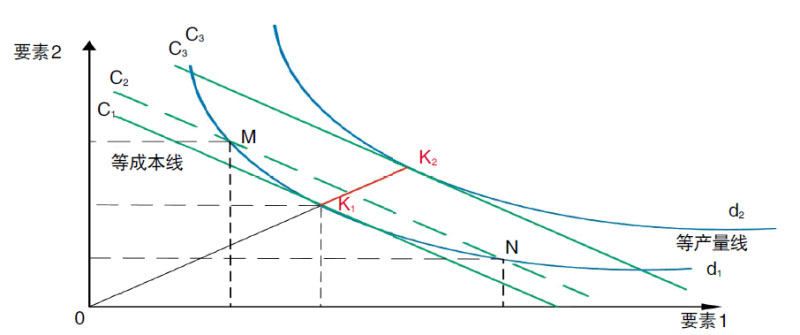 最優(yōu)生產理論揭示了生產者通過要素替代實現(xiàn)最小成本生產即資源優(yōu)化配置的機理。假設初始的要素組合是N點,生產者減少使用要素1,同時使用更多的要素2,直到K1點時,就找到了最小生產成本的要素組合。