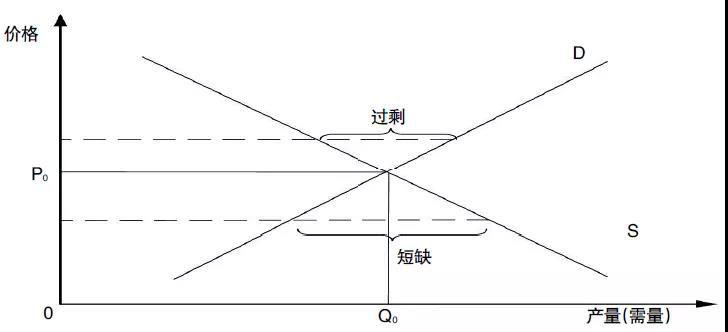 如圖1所示,當需求曲線D與供給曲線S相交時,市場供應與需求相等,市場在產量等于Q0和價格等于P0時出清。在完全競爭市場假設下,需求曲線與供給曲線的交點可以證明正是滿足邊際收益等于邊際成本條件并且社會福利最大的生產者與消費者的長期均衡點,Q0和P0分別稱為均衡產量和均衡價格。