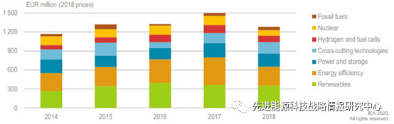 能源技術(shù)創(chuàng)新,包括研發(fā)(R&D)是歐洲“能源聯(lián)盟”的五大支柱之一。近年來(lái),歐盟一直在增加對(duì)能源研發(fā)的資助,“地平線(xiàn)歐洲”計(jì)劃在氣候、能源和交通方面投入150億歐元,在氣候行動(dòng)方面投入350億歐元。2018年“地平線(xiàn)2020”能源預(yù)算的一半用于可再生能源(占總量的27%)和能源效率(占23%)(圖1)。其中可再生能源的資金分配主要包括太陽(yáng)能、風(fēng)能、生物能源、地?zé)岷秃Q竽茉搭I(lǐng)域。而對(duì)能效技術(shù)的資助中,約三分之一用于工業(yè),其次用于建筑、交通和其他能效領(lǐng)域。2018年,電力和儲(chǔ)能及其他交叉技術(shù)合計(jì)占能源研發(fā)總量的30%自2016年以來(lái),用于交叉研究的資金在總預(yù)算中的份額翻了一番。