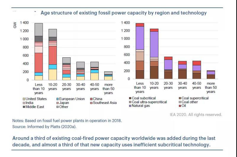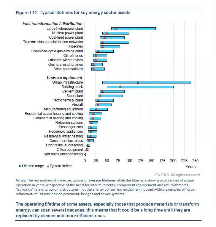 現(xiàn)有能源設(shè)施的在未來的碳排放與其壽命相關(guān)。以發(fā)電領(lǐng)域為例,在美國,現(xiàn)有煤電廠平均年齡超過40年,歐洲約35年,而大多數(shù)亞洲國家低于20年,在中國才13年。中國大約50%的現(xiàn)有火電在過去10年內(nèi)投運(yùn),85%的容量在過去的20年里投運(yùn)。在目前全球2100吉瓦的現(xiàn)有燃煤發(fā)電裝機(jī)容量(外加167吉瓦在建容量)中,到2050年仍有1440吉瓦繼續(xù)運(yùn)行,其中900吉瓦在中國。相比之下,燃?xì)獍l(fā)電廠壽命較短。現(xiàn)有的全球1800吉瓦燃?xì)獍l(fā)電裝機(jī)中(外加在建的110吉瓦),到2050年只有350吉瓦仍在繼續(xù)運(yùn)行。