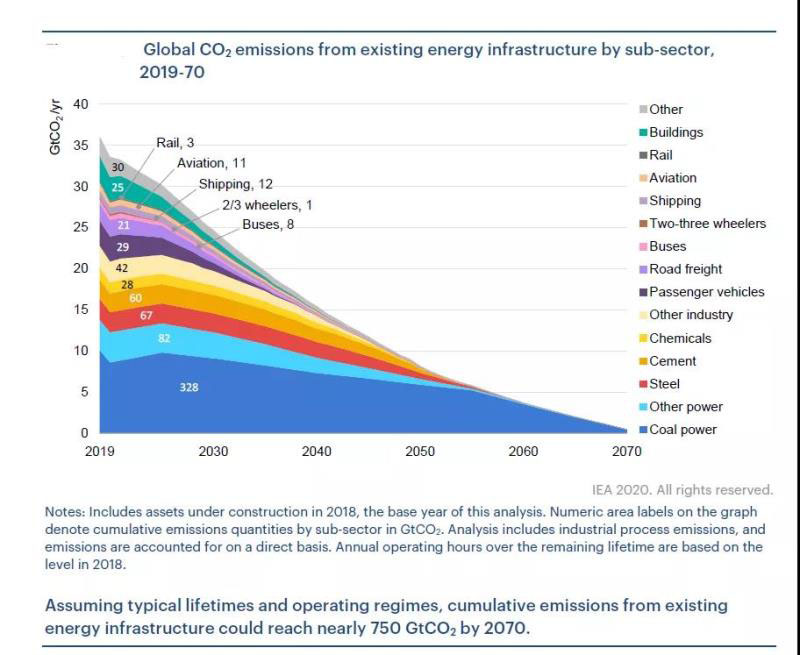 國際能源署(IEA)發(fā)表2020年版能源技術(shù)展望,其中評估了現(xiàn)有能源基礎(chǔ)設(shè)施的存量在剩余生命周期內(nèi)(2019-2070年)的二氧化碳排放總量。