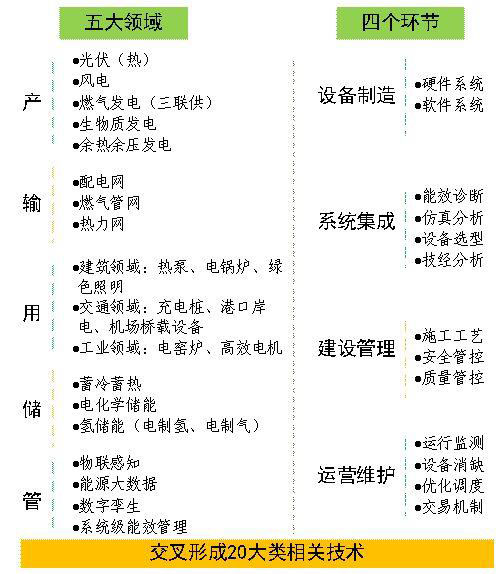 (一)以客戶需求為出發(fā)點,動態(tài)構(gòu)建綜合能源服務(wù)技術(shù)體系,強化技術(shù)提升目標(biāo)導(dǎo)向。從能源全產(chǎn)業(yè)鏈看,綜合能源服務(wù)技術(shù)可以劃分為“產(chǎn)、輸、用、儲、管”五大領(lǐng)域;從項目全生命周期看,各領(lǐng)域均包含設(shè)備制造、方案設(shè)計、建設(shè)管理、運營維護四個主要環(huán)節(jié),合計交叉形成20大類相關(guān)技術(shù)(5×4)。技術(shù)體系應(yīng)結(jié)合地域特點、行業(yè)發(fā)展階段等進行動態(tài)優(yōu)化調(diào)整。