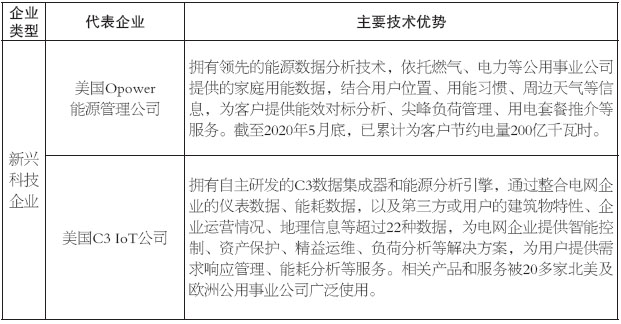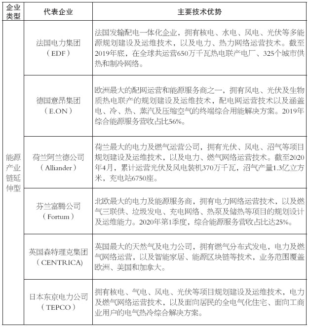 國外方面,受益于不同能源品種業(yè)務(wù)關(guān)聯(lián)緊密、行業(yè)壁壘較少的先天優(yōu)勢,大量傳統(tǒng)能源企業(yè)同時涉及電氣熱、產(chǎn)供銷等多能源全產(chǎn)業(yè)鏈業(yè)務(wù),為開展綜合能源服務(wù)奠定了強大的技術(shù)基礎(chǔ),代表企業(yè)為法國電力集團、德國意昂集團、日本東京電力公司等;近年來,新興科技企業(yè)依托領(lǐng)先的能源大數(shù)據(jù)技術(shù),深耕數(shù)據(jù)增值服務(wù)細(xì)分市場,代表企業(yè)為美國Opower、C3 IoT公司等。