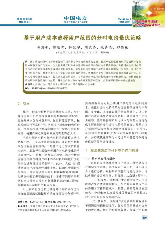 傳統(tǒng)的分時(shí)電價(jià)政策忽略了用戶參與分時(shí)電價(jià)政策的意愿,且用戶電價(jià)電量響應(yīng)行為建模未考慮用戶調(diào)整用電行為成本,為此提出基于用戶成本選擇用戶范圍的分時(shí)電價(jià)最優(yōu)策略。分析用戶改變用電行為所產(chǎn)生的調(diào)整成本與節(jié)省用電費(fèi)用的關(guān)系,推導(dǎo)分時(shí)電價(jià)機(jī)制下用戶電價(jià)電量響應(yīng)行為模型。當(dāng)用戶改變用電行為后,其生產(chǎn)成本高于實(shí)行分時(shí)電價(jià)前的電費(fèi),則對(duì)用戶參與分時(shí)電價(jià)政策的意愿評(píng)估為零,不納入分時(shí)電價(jià)實(shí)施范圍。仿真及實(shí)驗(yàn)結(jié)果顯示,與不選擇用戶范圍的傳統(tǒng)分時(shí)電價(jià)模型相比,該模型能夠反映用戶調(diào)整用電行為過(guò)程,科學(xué)選擇參與分時(shí)電價(jià)政策的用戶范圍,實(shí)現(xiàn)電網(wǎng)和用戶的總效益最優(yōu)。