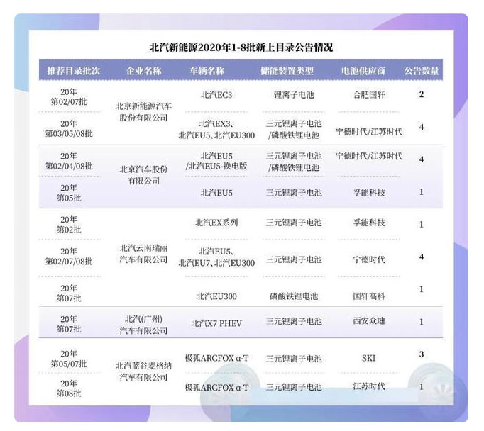在北汽新能源今年新上推薦目錄的產(chǎn)品中,只有兩款車型配套了孚能科技電池,其余大部分也采用了寧德時代的產(chǎn)品。