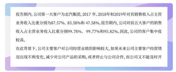 孚能科技發(fā)布的2019年銷量數(shù)據(jù)顯示,北汽集團(tuán)、長城汽車以及戴姆勒集團(tuán)這三大客戶貢獻(xiàn)了孚能科技76.7%的銷售額。2017年~2019年,公司對前五大客戶的銷售收入占主營業(yè)務(wù)收入比重分別99.78%、99.77%和95.82%。