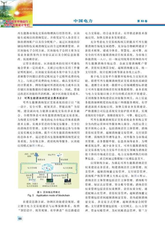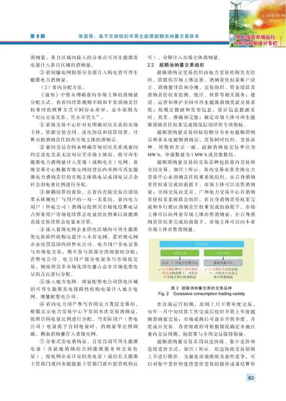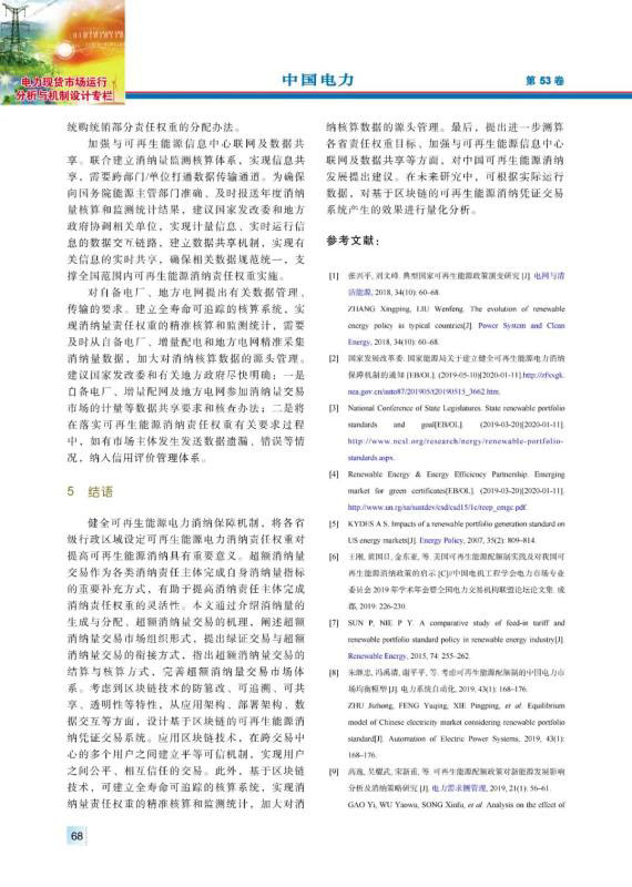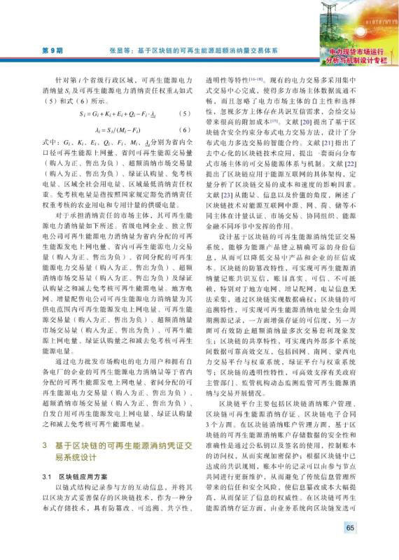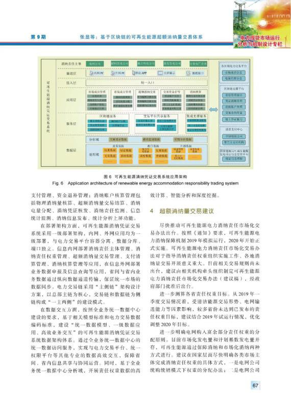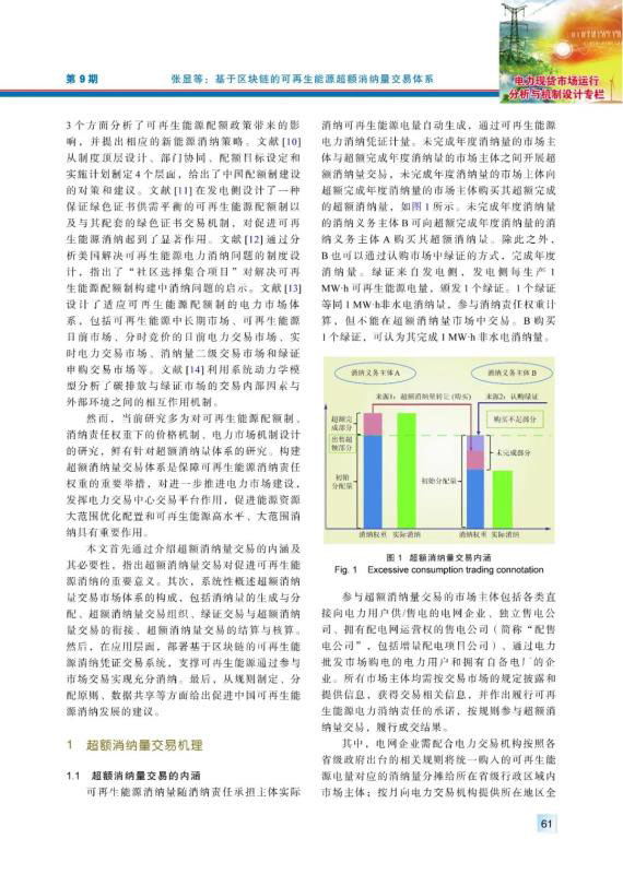 為加快構(gòu)建清潔低碳、安全高效的能源體系,促進可再生能源開發(fā)利用,2019年中國出臺政策對各省級行政區(qū)域設(shè)定可再生能源電力消納責(zé)任權(quán)重,建立健全可再生能源電力消納保障機制。超額消納量交易作為各類消納責(zé)任主體完成自身消納量指標的重要補充方式,對促進可再生能源消納具有重要意義。首先,介紹超額消納量交易的內(nèi)涵及其必要性,指出超額消納量交易的機理。其次,系統(tǒng)性闡述超額消納量交易市場體系的構(gòu)成,包括消納量的生成與分配、超額消納量交易組織、綠證交易與超額消納量交易的銜接、超額消納量交易的結(jié)算與核算。然后,考慮到區(qū)塊鏈技術(shù)在電力交易領(lǐng)域的良好應(yīng)用場景,部署基于區(qū)塊鏈的可再生能源消納憑證交易系統(tǒng),支撐可再生能源通過參與市場交易實現(xiàn)充分消納。最后,從規(guī)則制定、分配原則、數(shù)據(jù)共享等方面提出促進中國可再生能源消納發(fā)展的建議。