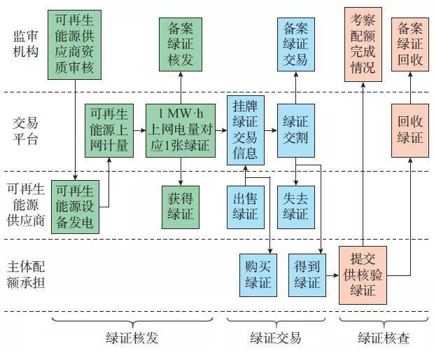 綠證的核發(fā)環(huán)節(jié)與可再生能源發(fā)電電量綁定??稍偕茉磁漕~是綠證市場的流通動(dòng)力,而綠證則是配額核算的重要依據(jù)。交易過程中,可再生能源發(fā)電商通過出售綠證獲得補(bǔ)貼,履責(zé)主體通過購買綠證完成消納指標(biāo)。綠證流通不受任何物理約束影響,無需集中出清,應(yīng)由其所有者決定具體的交易對(duì)象和交易價(jià)格。綠證交易天然是去中心化和分布式的,采用雙邊交易機(jī)制。而核查是綠證兌付配額制檢查并退出市場的階段。