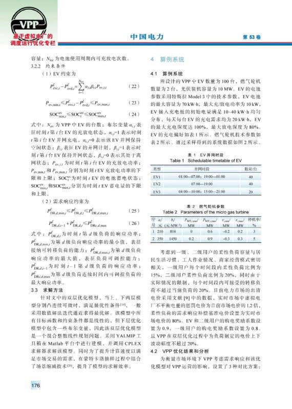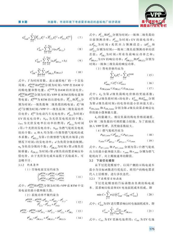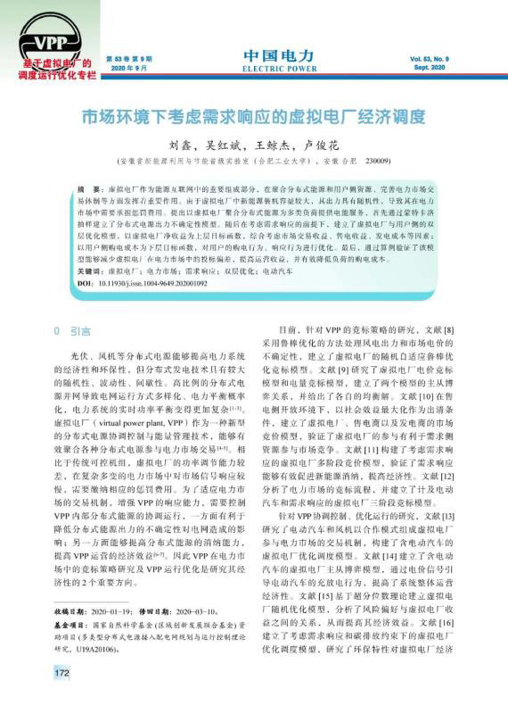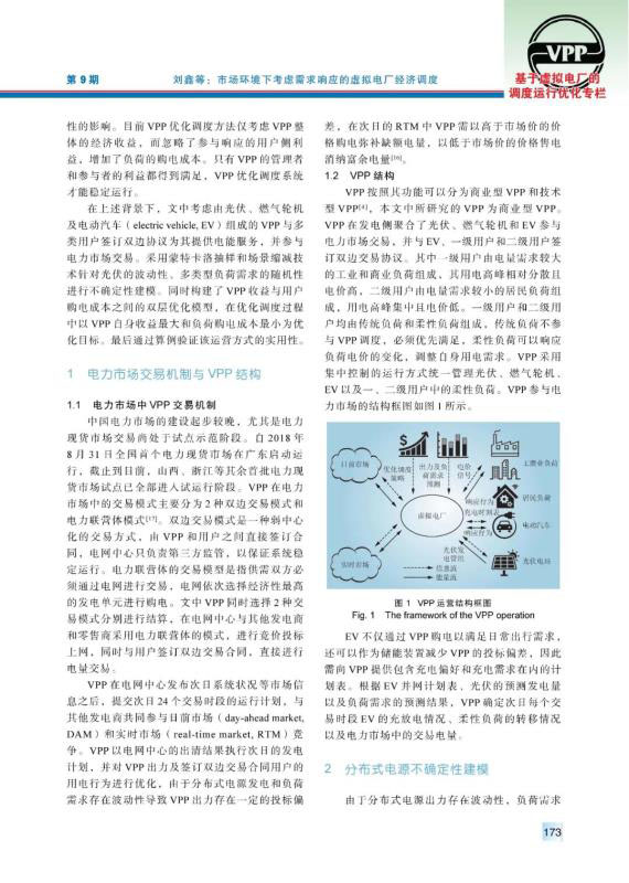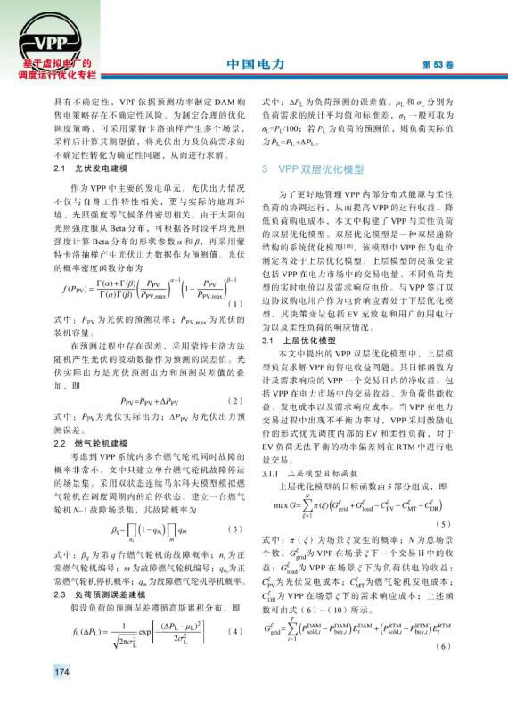 虛擬電廠作為能源互聯(lián)網(wǎng)中的重要組成部分,在聚合分布式能源和用戶側資源、完善電力市場交易體制等方面發(fā)揮著重要作用。由于虛擬電廠中新能源裝機容量較大,其出力具有隨機性,導致其在電力市場中需要承擔懲罰費用。提出以虛擬電廠聚合分布式能源為多類負荷提供電能服務,首先通過蒙特卡洛抽樣建立了分布式電源出力不確定性模型。隨后在考慮需求響應的前提下,建立了虛擬電廠與用戶側的雙層優(yōu)化模型,以虛擬電廠凈收益為上層目標函數(shù),綜合考慮市場交易收益、售電收益、發(fā)電成本等因素;以用戶側購電成本為下層目標函數(shù),對用戶的購電行為、響應行為進行優(yōu)化。最后,通過算例驗證了該模型能夠減少虛擬電廠在電力市場中的投標偏差,提高運營收益,并有效降低負荷的購電成本。