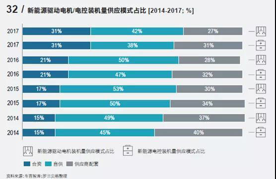 而為了加強(qiáng)對(duì)新技術(shù)、新產(chǎn)品的掌控,保證零部件供應(yīng)的安全,越來(lái)越多的主機(jī)廠在關(guān)鍵部件上開(kāi)始采用自主研發(fā)或者合作共研的方式,減少投資需求并提升研發(fā)能力。根據(jù)報(bào)告統(tǒng)計(jì)的數(shù)據(jù),自2014年開(kāi)始,新能源驅(qū)動(dòng)電機(jī)、電控中,自研自供一直占有不小的比例。而從變化趨勢(shì)來(lái)看,供應(yīng)商配套的占比在穩(wěn)步下降,自研自供比例雖然也略有下降,但是也轉(zhuǎn)到了合資這一塊。