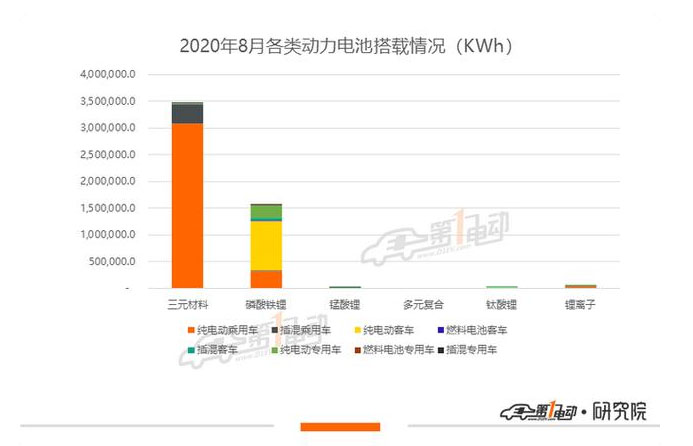 8月三元材料的搭載量為3.46GWh,環(huán)比增長8.6%,其中乘用車占比99.4%,三元材料搭載量占總搭載量的67.1%。磷酸鐵鋰電池8月總搭載量為1.56GWh,環(huán)比微跌4.3%,在月度裝機(jī)中的占比為30.4%。在純電動乘用車領(lǐng)域,磷酸鐵鋰電池的裝機(jī)量環(huán)比上升了1.1%。