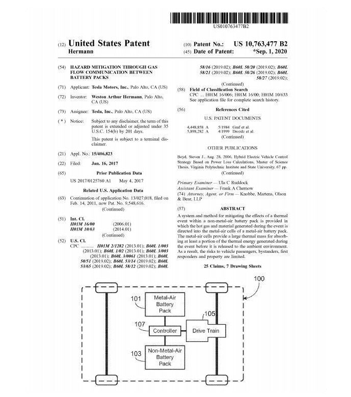 在動(dòng)力電池的技術(shù)發(fā)展上,電動(dòng)汽車制造商除了提高能量密度降低電池價(jià)格之外,還想盡可能地保證安全。目前電動(dòng)汽車自燃最常見原因是熱失控,鋰離子電池發(fā)熱量太大,排出的熱氣引發(fā)了周圍燃燒。2020年9月1日,特斯拉獲得的一項(xiàng)美國商標(biāo)專利局新專利(美國專利號(hào)10763477)顯示,特斯拉希望通過將金屬空氣電池組連接到主電池組來減輕熱失控,進(jìn)而防止自燃的發(fā)生。