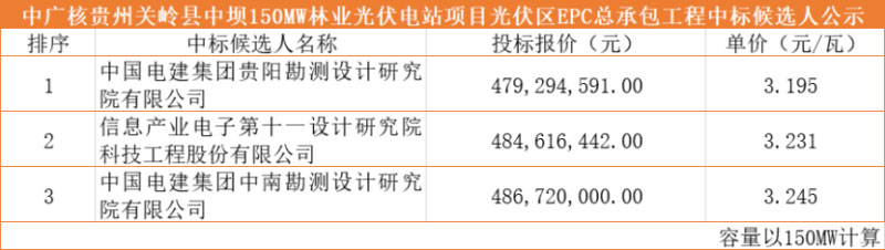 2020年9月15日,中廣核貴州關(guān)嶺縣中壩150MW林業(yè)光伏電站項目光伏區(qū)EPC總承包工程中標候選人公示。根據(jù)公告,中國電建集團貴陽勘測設(shè)計研究院有限公司以總價479,294,591.00元、單價3.195元/瓦的報價位列第一中標候選人。值得一提的是,此報價為三位中標候選人中的最低報價。