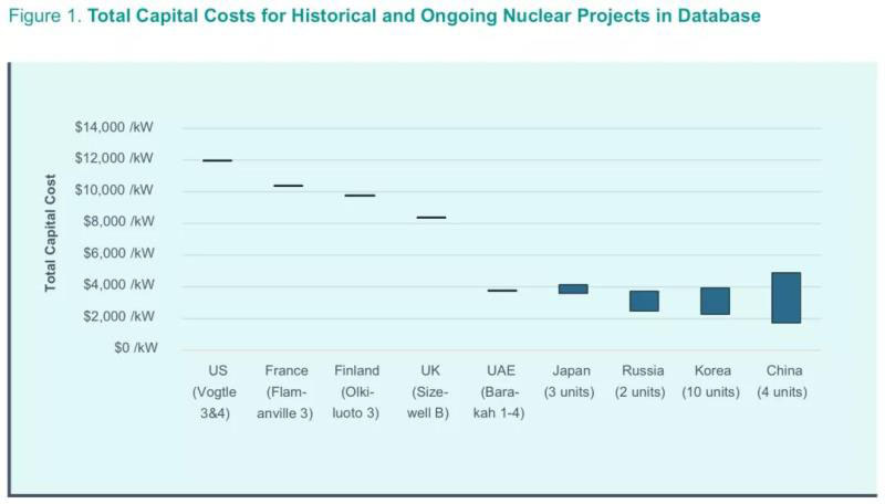 縱觀世界各地最近建成的核電站,其成本相差可高達(dá)4倍。如圖所示,中國(guó)、日本和韓國(guó)的核電站成本相對(duì)較低,顯示出了積極的學(xué)習(xí)曲線效應(yīng)(最近的一個(gè)例子是韓國(guó)核工業(yè)正在向阿聯(lián)酋巴拉卡交付四個(gè)核動(dòng)力機(jī)組)。
