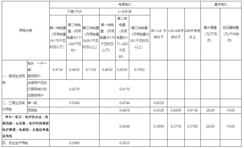 注:1.上表所列價(jià)格,均含農(nóng)網(wǎng)還貸資金2分錢、國(guó)家重大水利工程建設(shè)基金0.115分錢。2.上表所列價(jià)格,除農(nóng)業(yè)生產(chǎn)用電外,均含大中型水庫(kù)移民后期扶持資金0.23分錢、可再生能源電價(jià)附加(其中:居民生活用電0.1分錢,其他用電1.9分錢)。3.核工業(yè)鈾擴(kuò)散廠和堆化工廠生產(chǎn)用電價(jià)格,按表所列的分類電價(jià)降低1.7分錢執(zhí)行;抗災(zāi)救災(zāi)用電按表所列分類電價(jià)降低2分錢執(zhí)行。4.對(duì)城鄉(xiāng)“低保戶”和農(nóng)村牧區(qū)“五保戶”家庭每戶每月設(shè)置15度免費(fèi)用電基數(shù),分別按照表中居民生活用電第一檔電量電價(jià)標(biāo)準(zhǔn)收取及返還。對(duì)執(zhí)行居民生活用電的電壓等級(jí)在35-110千伏及以上的用戶,按表中1-10千伏所對(duì)應(yīng)的電量電價(jià)標(biāo)準(zhǔn)執(zhí)行。