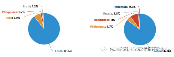 圖4 2020年上半年各國(guó)新規(guī)劃(左)和新建設(shè)(右)燃煤機(jī)組容量(單位:%)
