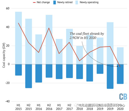 圖1 2020年全球燃煤發(fā)電裝機(jī)總量首次出現(xiàn)下降(單位:GW)