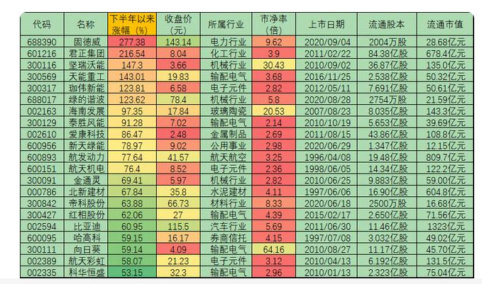 表:下半年以來新能源板塊漲幅超50%個股市場表現(xiàn)一覽