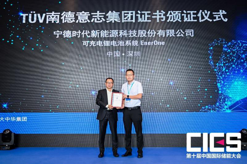 9月24-26日,由中國化學(xué)與物理電源行業(yè)協(xié)會主辦、TüV南德意志集團(以下簡稱“TüV南德”)聯(lián)合主辦,中國化學(xué)與物理電源行業(yè)協(xié)會儲能應(yīng)用分會、中國儲能網(wǎng)聯(lián)合承辦的第十屆中國國際儲能大會在深圳鵬瑞萊佛士酒店隆重召開。本屆儲能盛會吸引了全球儲能行業(yè)的眾多領(lǐng)軍企業(yè)參加。9月25日,在儲能安全、標準與檢測分會場上,TüV南德為寧德時代新能源科技股份有限公司(以下簡稱“寧德時代”)可充電鋰電池系統(tǒng)EnerOne頒發(fā)TüV南德認證證書。該獲證產(chǎn)品包含電芯、模組、電柜、系統(tǒng),認證范圍覆蓋歐洲和北美標準要求。TüV南德大中華集團智慧能源事業(yè)部副總裁許海亮、寧德時代儲能解決方案部部長邱冬等嘉賓出席了頒證儀式。該證書的獲得,表明該產(chǎn)品滿足儲能應(yīng)用的國際標準要求,為寧德時代進一步深入歐洲和北美等國際市場奠定了良好的基礎(chǔ)。