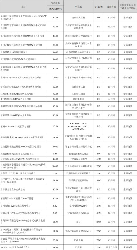 根據(jù)2020年半年報(bào),了解到陽光電源的28個光伏電站以及5MW以下小型分布式項(xiàng)目的相關(guān)情況,這些光伏項(xiàng)目總規(guī)模為1351.41MW(約1.35GW),所有項(xiàng)目的逆變器皆自供;其中除了衢州集聚區(qū)30MW農(nóng)光互補(bǔ)項(xiàng)目和達(dá)拉特旗領(lǐng)跑者基地100MW光伏發(fā)電項(xiàng)目還未并網(wǎng),其他26個項(xiàng)目全都完成了并網(wǎng),詳情如下: