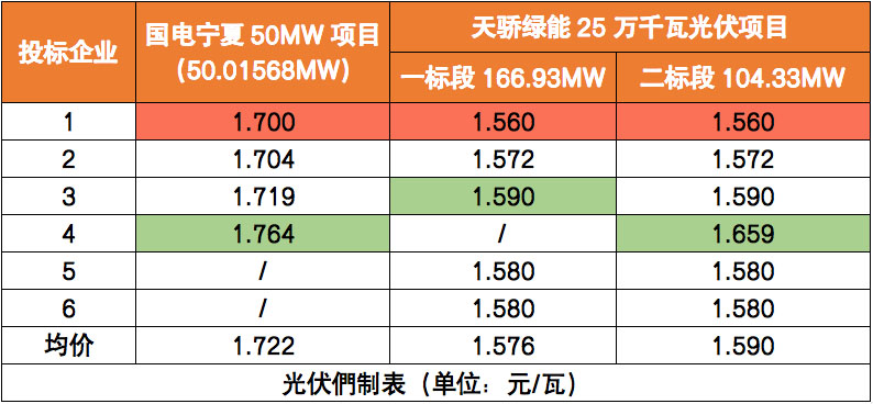 從價(jià)格分析,國(guó)電電力寧夏海子井50MW項(xiàng)目最低報(bào)價(jià)為1.7元/瓦,最高報(bào)價(jià)為1.764元/瓦,平均價(jià)格落在1.722元/瓦。而國(guó)家能源集團(tuán)天驕綠能25萬千瓦項(xiàng)目最低報(bào)價(jià)為1.56元/瓦,最高報(bào)價(jià)為1.659元/瓦,平均價(jià)格1.6元/瓦以下;從組件規(guī)格來看,投標(biāo)企業(yè)2為500瓦,其他企業(yè)均以440-445瓦組件進(jìn)行投標(biāo)。
