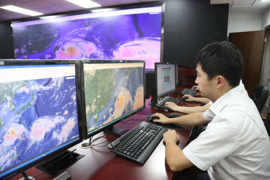 圖為國家電網(wǎng)臺(tái)風(fēng)預(yù)警監(jiān)測中心員工值班監(jiān)測臺(tái)風(fēng)。陳天文攝
