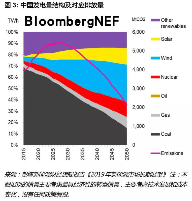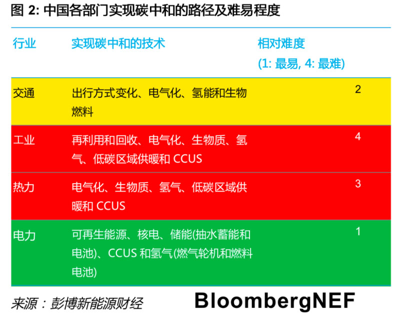 電力行業(yè)實(shí)現(xiàn)碳中和目標(biāo)的難度或許是各行業(yè)中較低的,但實(shí)現(xiàn)100%零碳發(fā)電仍然非常具有挑戰(zhàn)性。彭博新能源財(cái)經(jīng)的《2019年新能源市場長期展望》報(bào)告提出,中國煤電發(fā)電量將在2027年達(dá)峰。2050年,化石燃料電廠發(fā)電量(主要為燃煤和燃?xì)怆姀S)仍占中國總發(fā)電量的25%。為解決這部分剩余化石燃料電廠的減排問題,中國需要采用多種手段,部署更多的可再生發(fā)電和核電,并結(jié)合CCUS、氫能和燃料電池等新興技術(shù)。
