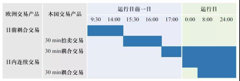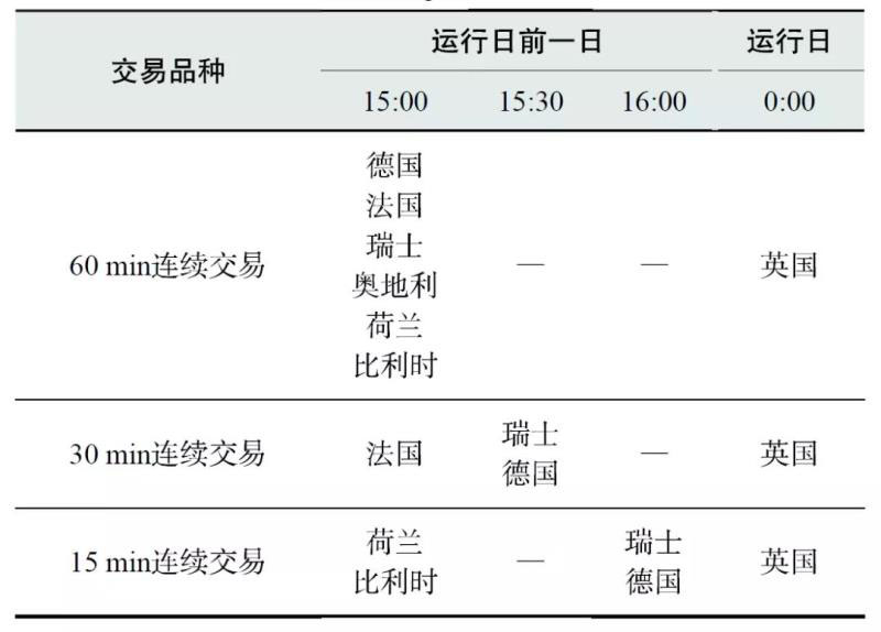 日內(nèi)連續(xù)交易市場(chǎng)針對(duì)各國(guó)交易體系的特點(diǎn)共設(shè)置了60分鐘連續(xù)交易、30分鐘連續(xù)交易及15分鐘連續(xù)交易三個(gè)交易產(chǎn)品,所有產(chǎn)品于運(yùn)行日前一日15:00時(shí)開(kāi)始,連續(xù)交易直至運(yùn)行日各國(guó)市場(chǎng)交割前。市場(chǎng)交易時(shí)序如表1所示。