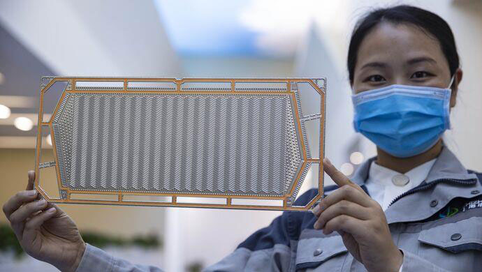 一塊極板的厚度僅為75微米左右,比紙還薄,要在板上沖壓出密密麻麻的流道,讓氫氣、氧氣和冷卻液在那里傳輸,其技術(shù)難度可想而知?!盀榻鉀Q一沖壓就裂的難題,我們做了10年基礎(chǔ)研究和工程驗(yàn)證?!彼{(lán)樹槐說,經(jīng)過機(jī)械、流體力學(xué)、工程熱力學(xué)等多學(xué)科交叉攻關(guān),交大團(tuán)隊(duì)通過微細(xì)成形過程仿真模型,梯度圓角設(shè)計(jì)、應(yīng)力積分回彈補(bǔ)償?shù)任⒓?xì)成形工藝設(shè)計(jì),開發(fā)出不同于宏觀制造的介觀制造新工藝。檢測報(bào)告顯示,超薄金屬雙極板制造工藝的誤差控制在10微米以內(nèi)。